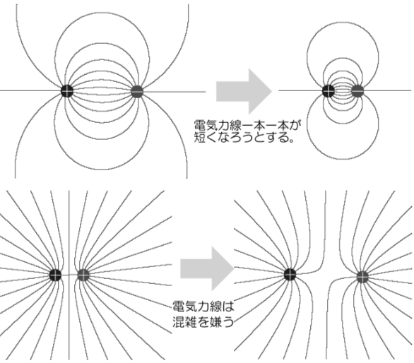 電気力線と磁力線は別のものではあるが、似たような力学的性質を持っていると考えると、図のようにして引力と斥力がはたらくことがわかる。