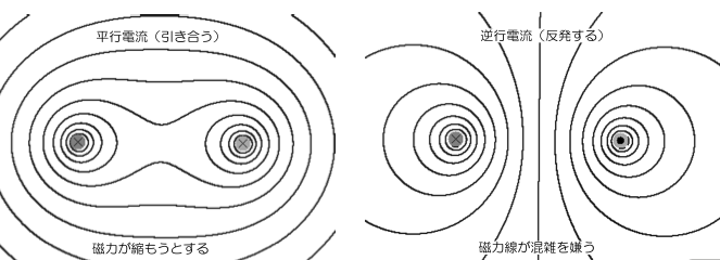 電流と電流の間に働く力は引力か斥力か(電流が同行の場合、逆行の場合でそれぞれ答えよ)