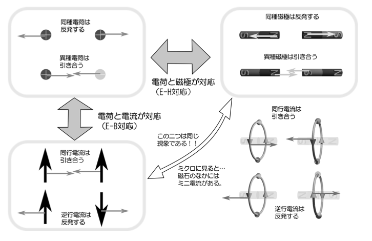 電気の法則と磁気の法則はそれぞれつながっており、別々に存在しているものではない(またこれが「エネルギーを低くする方向へと力が働く」という意味で力学ともつながっているわけである)。