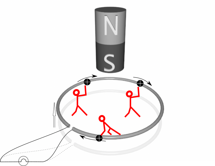 ↑残念ながら今は抵抗(電球)が磁場の変化ともコイルの運動とも関係ない部分にあって、そこで電流がB→Aに流れているのだから、この説明では説明にならないし、物理的におかしい。