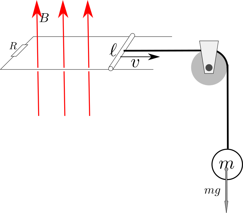 ここで減っているのは、質量$m$のおもりの位置エネルギーで、単位時間あたり$mgv$ずつ減っている。よって、 $$ mgv={B^2\ell^2v^2\over R} $$ という式が出る。これを整理すると($I={B\ell v\over R}$も使って) $$ mg={BI\ell} $$ という式になる。これは棒に働く二つの力(重力と磁場による力)が釣り合っているという式。