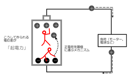 電池は、陰極から陽極へと正電荷を送り込む(または、陽極から陰極へと負電荷を送り込む)能力がある(図では赤い人で示した)。その能力は化学反応で得られているので、中の物質の化学反応が終わってしまうと電池の起電力もなくなる。結果としてできる電位差が$V$ボルトであれば、「この電池は起電力$V$ボルトである」と言う。
