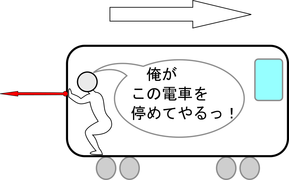 ということは、電車に働く二つの力も大きさが等しく逆向きなので、電車には力が働かないことになる。よってこんなことをしても電車の速度を変えることはできない。