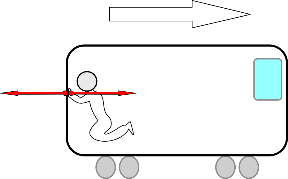 のように電車の前の壁にぶつかる。ぶつかったときに再び電車は加速し、人間は電車内で静止する。つまり、結局この人間が空中にいる間だけ電車は遅くなることになる。