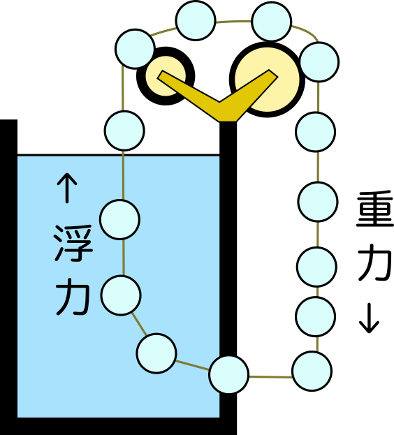 下の図のように、ベルトで結び付けられたピンポン玉をつないだものを、半分だけが水中にあるようにする。