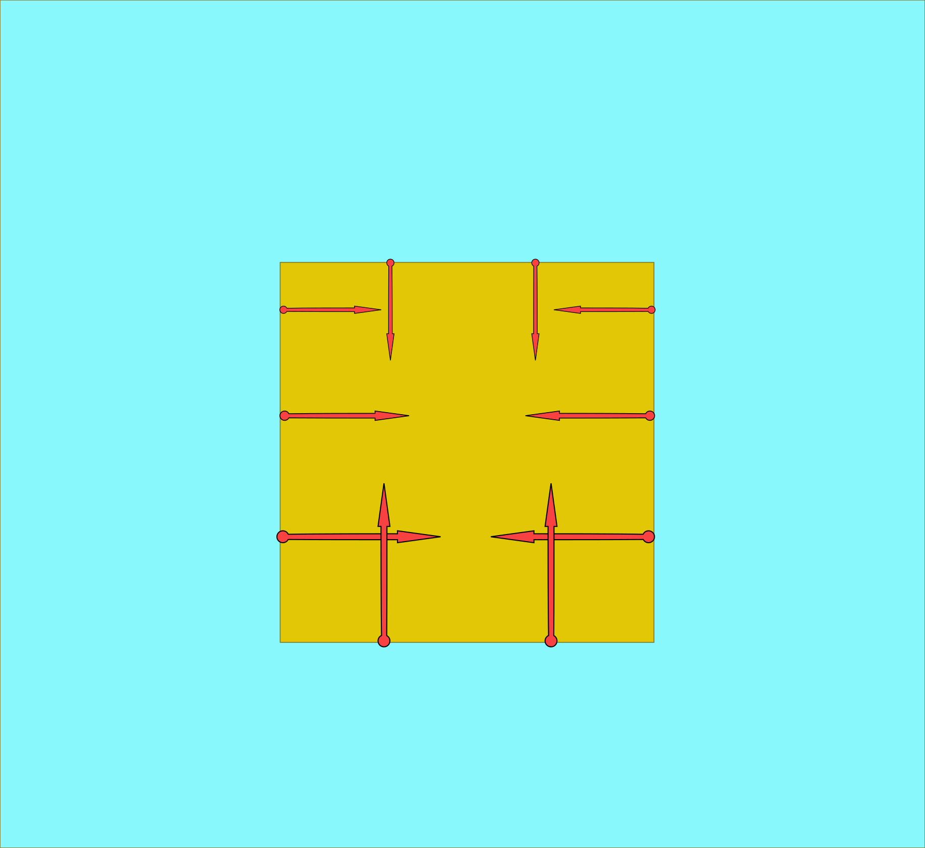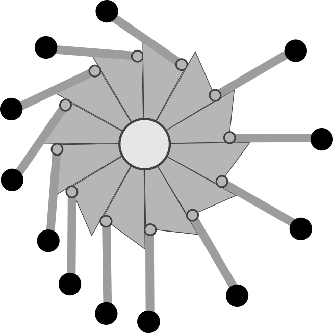 これは上の機械と同様、浮力がもともと水圧の合力であることを考えて上のような図を書いてみると、一個一個の水圧は(円盤の中心に向かう力なので)円盤を回す力のモーメントを持ってない(そもそも円盤を回そうとしていない)。この水圧をいくら集めても、回転は発生しない。