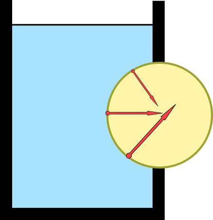 浮力は実は水の圧力(水圧)の合力である。物体が水中にあるときは、上の図のように「深いところほど強くなる水圧」が働く。これを足算すると上向きの力が残る。これが浮力。
