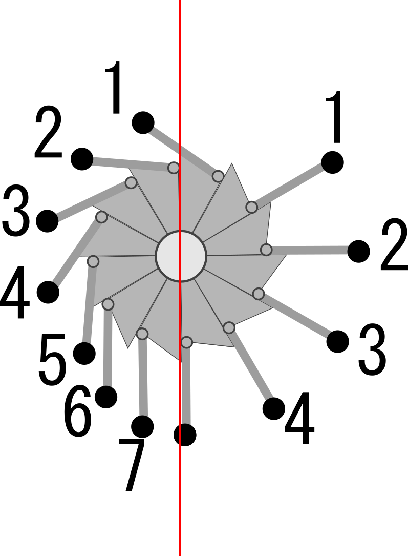 車輪の左側にあるおもりと右側にあるおもりの数を比べると、左の方が多い。つまり一個ずつのおもりを比べるとのモーメントがつりあっていないように見えるが、全体を考えると数が多い分だけ左が巻き返して、結果として引き分けになり、動かない。