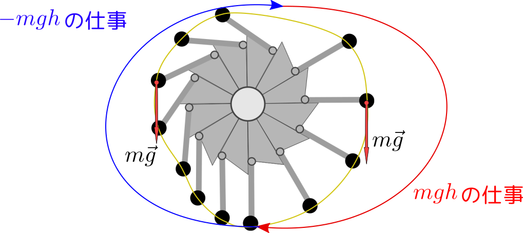 たとえば最初に考えたレバーの永久機関の場合、永久機関に仕事をしてくれるのは重力である。では重力のする仕事はどれくらいだろう、と勘定してみると、