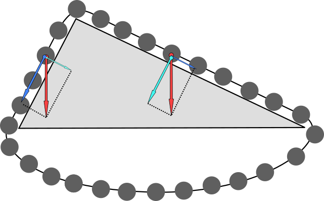 一個一個のおもりに働く重力は同じ大きさでも、斜面に平行な方向の成分の力は異なる。図でもわかるように左側の方が水平方向の分力は大きい。これがおもりの数の少なさとちょうどバランスして、分力の和は左右で同じになることが計算するとわかる。