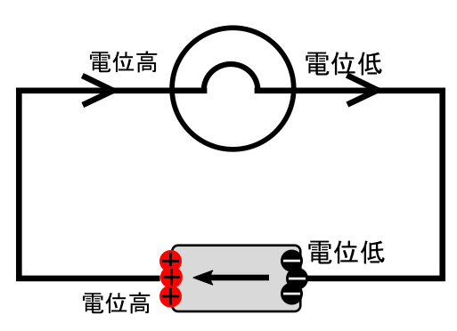 これが「電球を通る前の電荷と通った後の電荷の違い」である。電位差が高い方から低い方に正電荷が移動する実際には低い方から高い方へと電子が移動するが、エネルギーの収支は同じ。ことによってエネルギーが下がり、その分のエネルギーが電球から出る光となる。