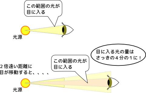 この「距離の自乗に反比例」という性質は、「光源からの距離と明るさの関係」に似ている。