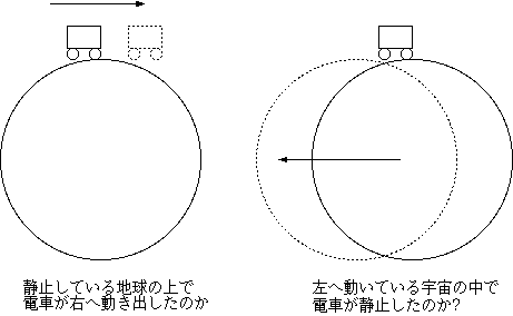きるし、「電車が止まっていて、宇宙全体が逆向きに等速運動している」と考えることもできる。どちらで考えても、電車内で起こる物理現象は同じである。つ