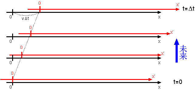 で表される線であることに注意せよ。つまりt軸とt′軸が同じ方向を向かないのはxとx′にずれがあるからなのである。この二つのグラフは、グラフを水平