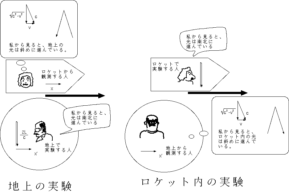 いていなくても、同時に到着する。しかし、この立場で考えると、ある二つの事象が、エーテル風がない時には同時であるのに、吹いている時には同時に起こら