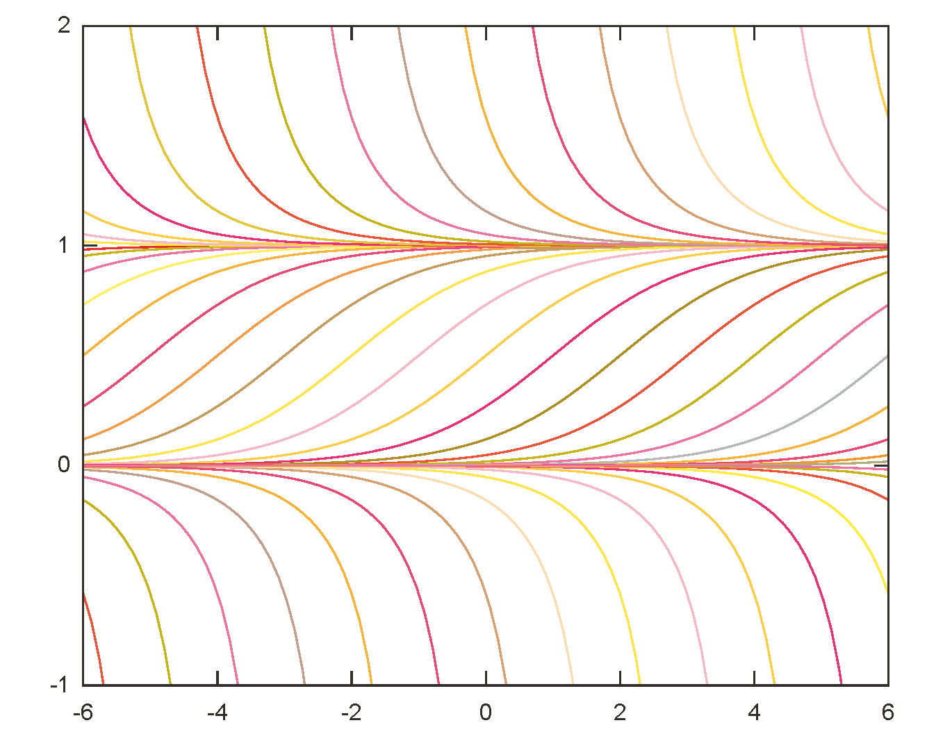 $\ycol{y}$の範囲を拡大して、1より大きい場合や0より小さい場合も含めてどのような関数になっているかを示したのが上の図である。この場合$\ycol{y}<0$のとき、$\ycol{y}>1$のときは${\ycol{y}\over 1-\ycol{y}}$が負になるので、解として$\ycol{y}={1\over 1-\E^{-k \tcol{t}-C}}$(複号がマイナスの方)を取る。解曲線全体を見ると、$\ycol{y}=0$から離れていき、$\ycol{y}=1$に引き寄せられていることがわかる。