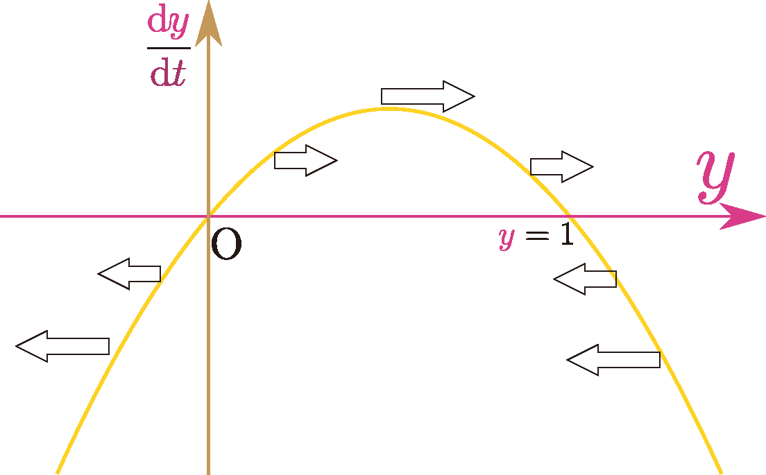 上のグラフが$ {\coldy\over \coldt}=k\ycol{y}(1-\ycol{y})$のグラフである。${\coldy\over \coldt}$は$\ycol{y}=0$と$\ycol{y}=1$で0となり、その間の範囲で正、それ以外の場所で負である。よって時間経過した時の変化を考えると、$0<\ycol{y}<1$では増加し、それ以外では減少する。結果として$\ycol{y}$の値は$\ycol{y}=1$へと集まっていく(そして、$\ycol{y}=0$からは離れていく)という傾向を示す。