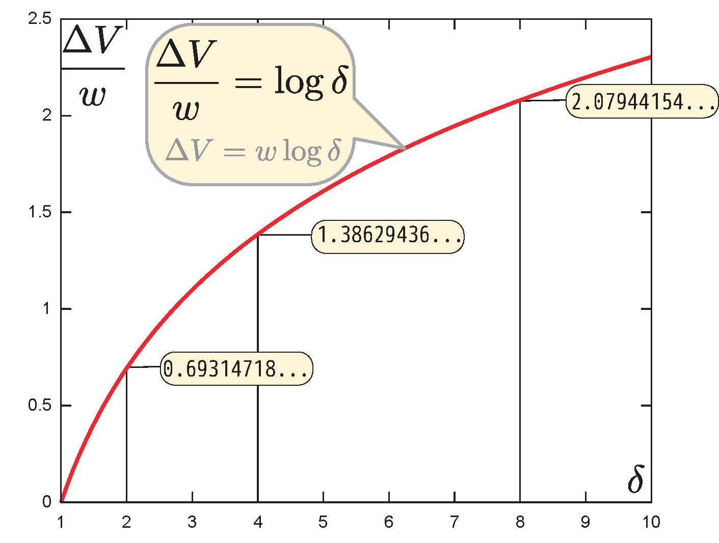 $\delta={m_0\over m_1}$この$\delta$は変化量を表す$\delta$ではなく、「$\delta$」1文字で一つの数。は「質量比」(文字通り、噴射前と噴射後の質量の比)と呼ばれる。グラフで分かるように、$\delta$を大きくしても$\ao{{\Delta V}}$はどんどん増えるというわけにはいかない($\log x$という関数は傾き${1\over x}$だから、傾きがどんどん緩くなる)。性能を上げるには噴射速度$w$(燃料の質に大きく左右される)が大事であることがわかる。