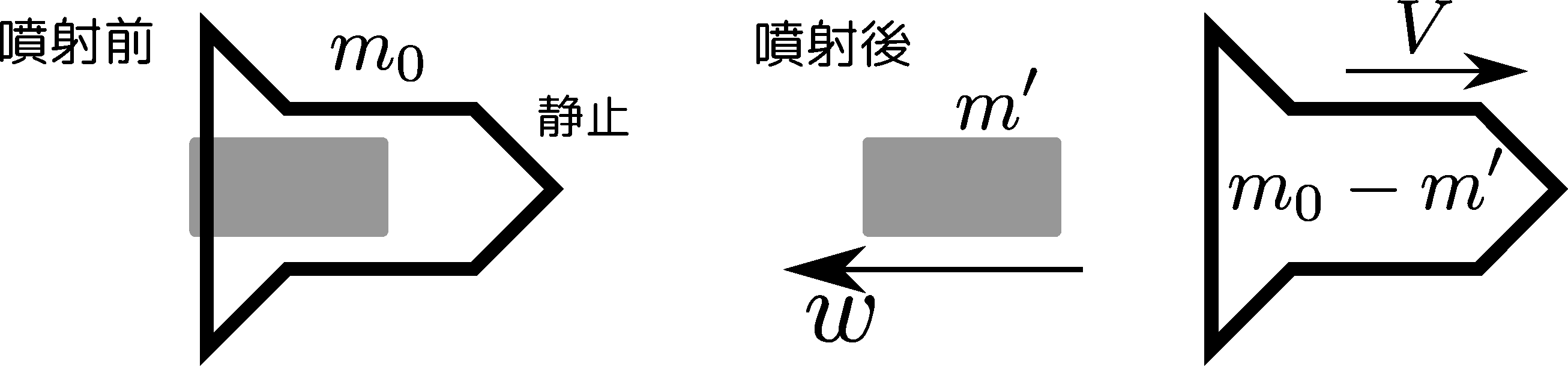 静止していた質量$m_0$のロケットが質量$m'$の推進剤(燃料を燃焼させた結果であるガスなど)を速さ$w$で後方に噴射した。噴射後のロケットが速さ$V$になる。