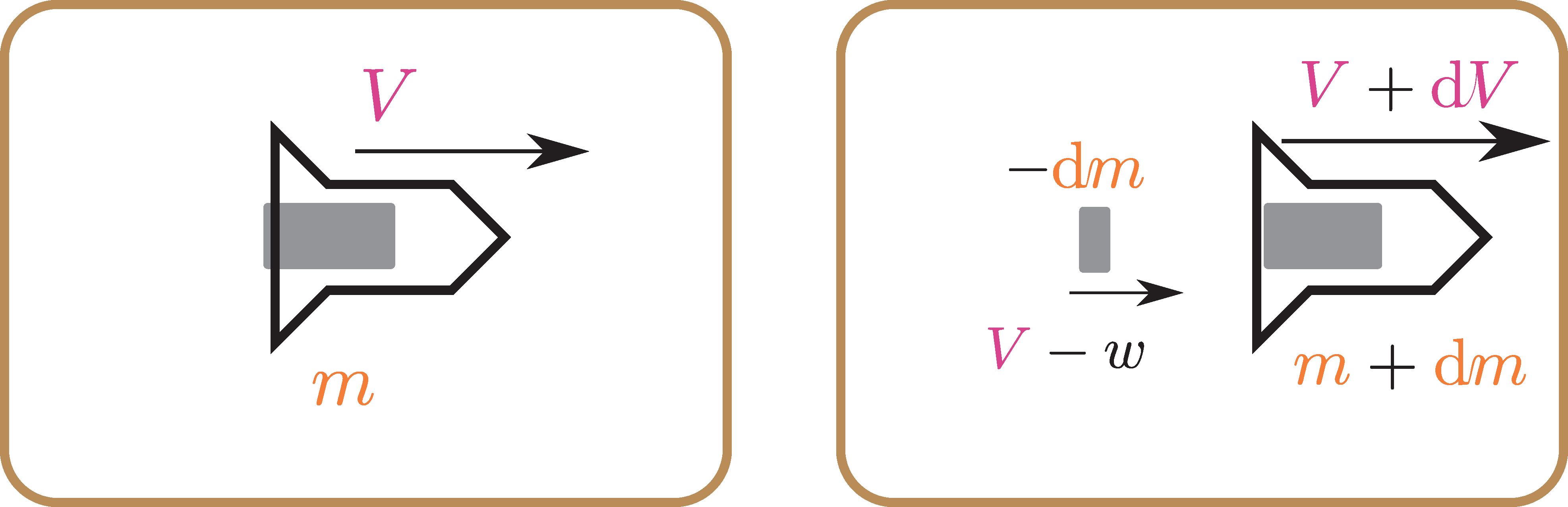上の大間違いは、「ロケットの質量も速度も連続的に少しずつ変化していく量なのにまるで一気に変わったかのように考えてしまった」点が間違いである自然は飛躍しないという言葉があるが、それは「自然現象は微小変化の積み重ねで起こる」ということだと解釈できる。連続的に少しずつ変化していく量は微積分を使って表現しなくてはいけない。ここから下では、$\aka{m}$や$\ao{V}$は連続的に変化する変数(色付き)として扱う。。すぐ後で述べるように推進剤の速さは外部から見て一定にならないという点も間違っている。そこで、(全体の変化を一気に考えるのではなくそのうちの一部を取り出して)微小変化について絵を描くと以下のようになる。