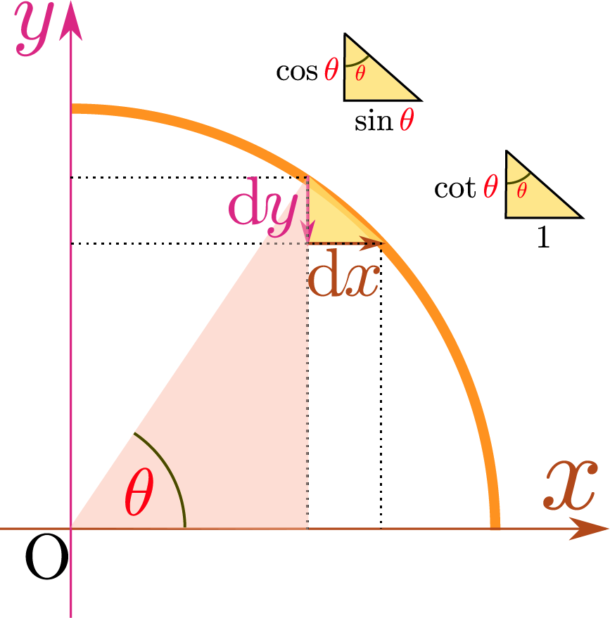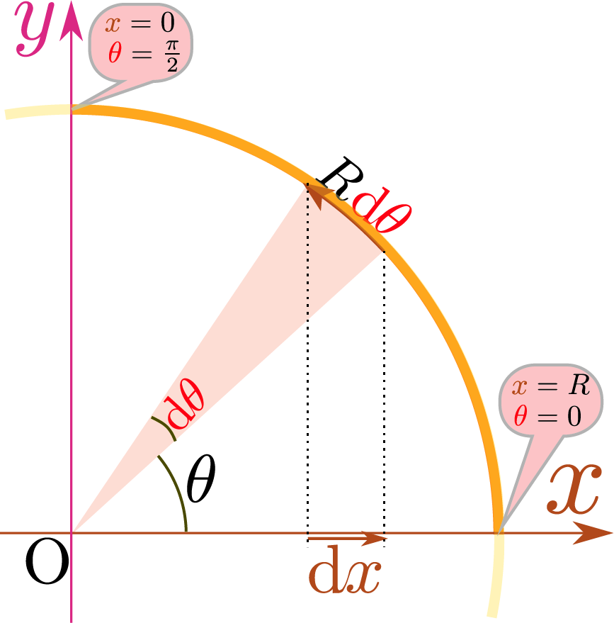 上の計算は、$\xcol{x},\ycol{y}$がともに別のパラメータの関数だとしてもよい。パラメータに$\thetacol{\theta}$を使い\文中式{$\coldx=-R\sin\thetacol{\theta}\coldtheta,\coldy=R\cos\thetacol{\theta}\coldtheta$}と考えて、 \begin{equation} \sqrt{\coldx^2+\coldy^2}=\sqrt{R^2\sin^2\thetacol{\theta}\coldtheta^2+R^2\cos^2\thetacol{\theta}\coldtheta^2} =R\coldtheta \end{equation} のように「微小長さ」を計算してから$\thetacol{\theta}$を$0$から${\pi\over 2}$まで積分してもよい(結果は同じ)。