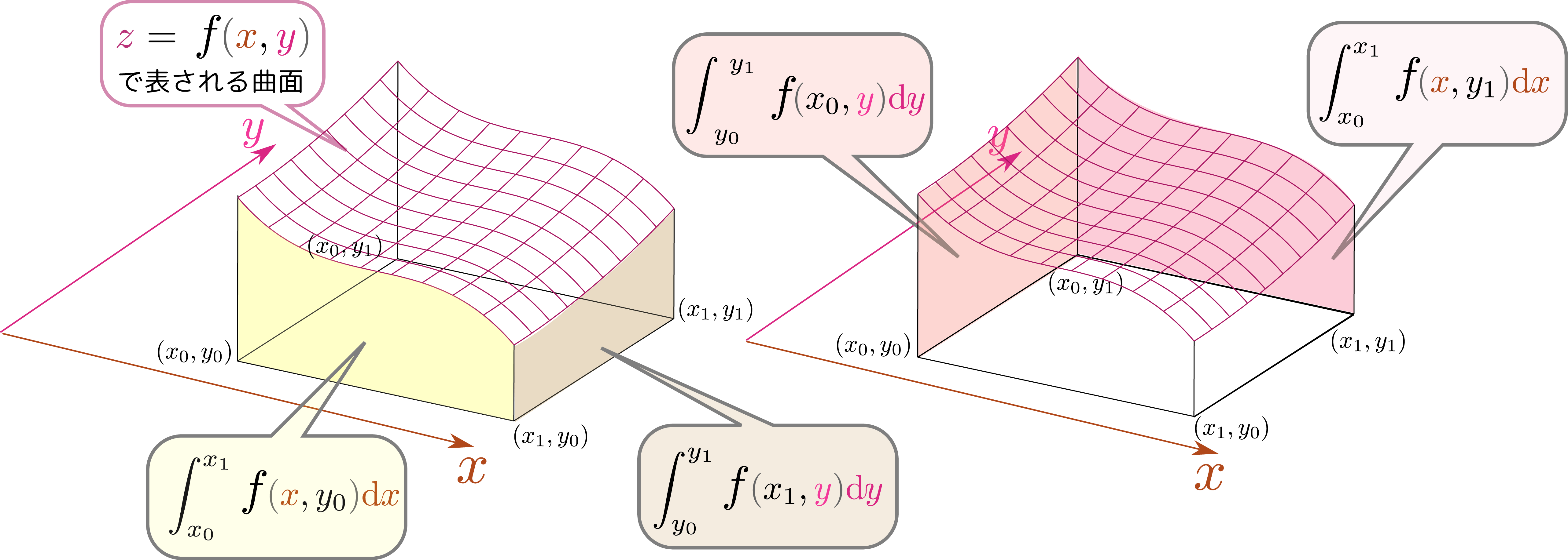 $\int_{y_0}^{y_1}f\kakko{x_0,\ycol{y}}\coldy+ \int_{x_0}^{x_1}f\kakko{\xcol{x},y_1}\coldx$