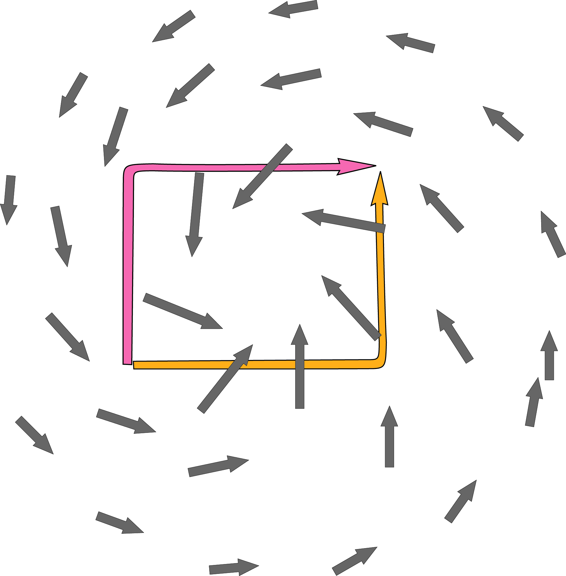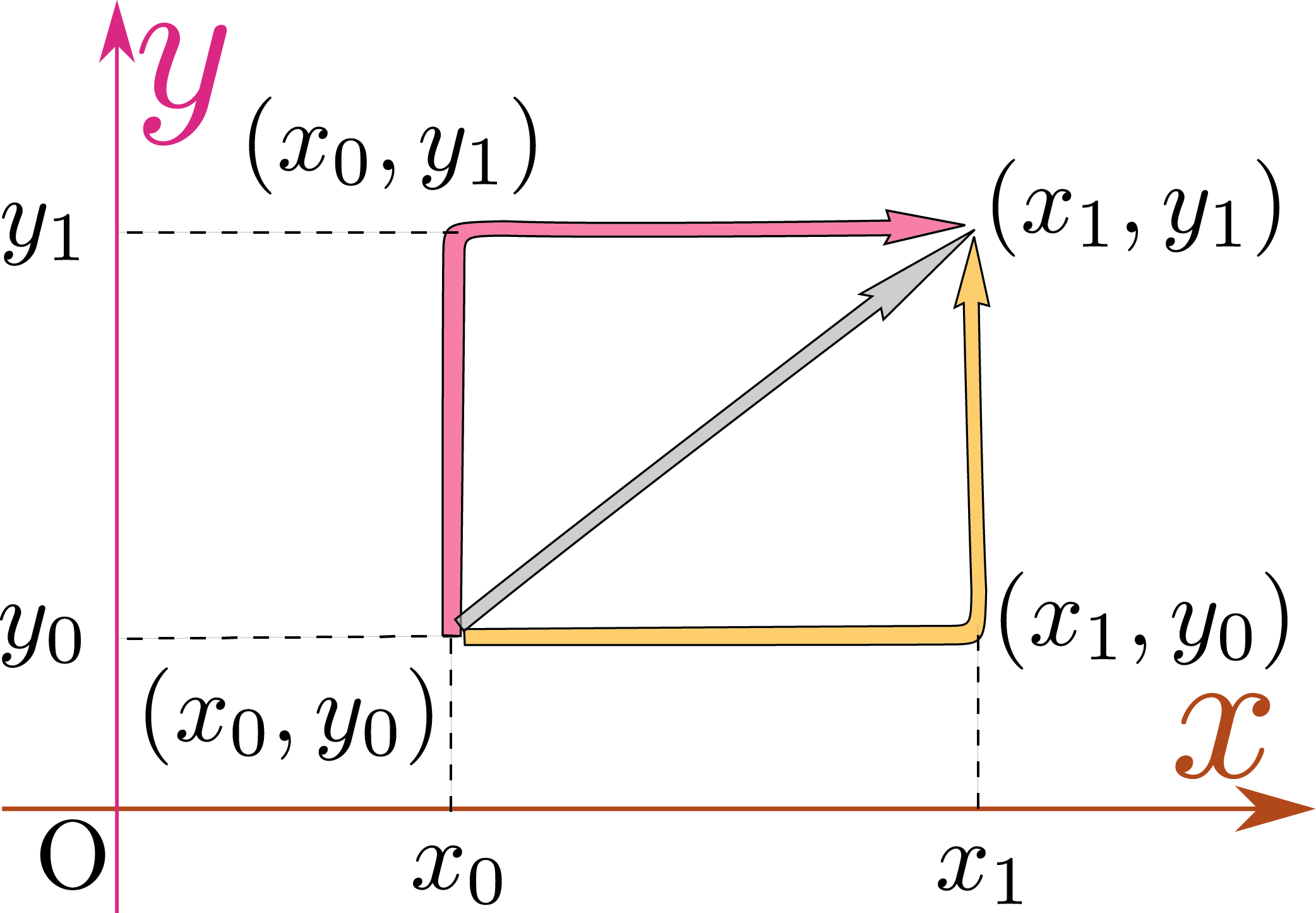 という経路に沿った積分は、どちらも$(x_0,y_0)$から$(x_1,y_1)$までの積分である。要は北東にある自宅に帰るのに、「東に行ってから北へ行くか、北に行ってから東に行くか」という選択肢がある。この二つの積分結果は運が良くない限り一致しない。