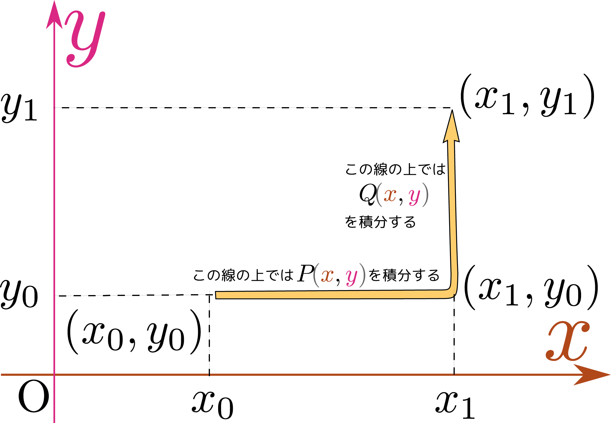 今度は図のように$\xcol{x}$方向の積分をするときと$\ycol{y}$方向で積分するときの被積分関数を変えて、 \begin{equation} \int_{x_0}^{x_1}P\,\kakko{\xcol{x},y_0}\coldx + \int_{y_0}^{y_1}Q\,\kakko{x_1,\ycol{y}}\coldy \end{equation} のような積分を考えることにする。