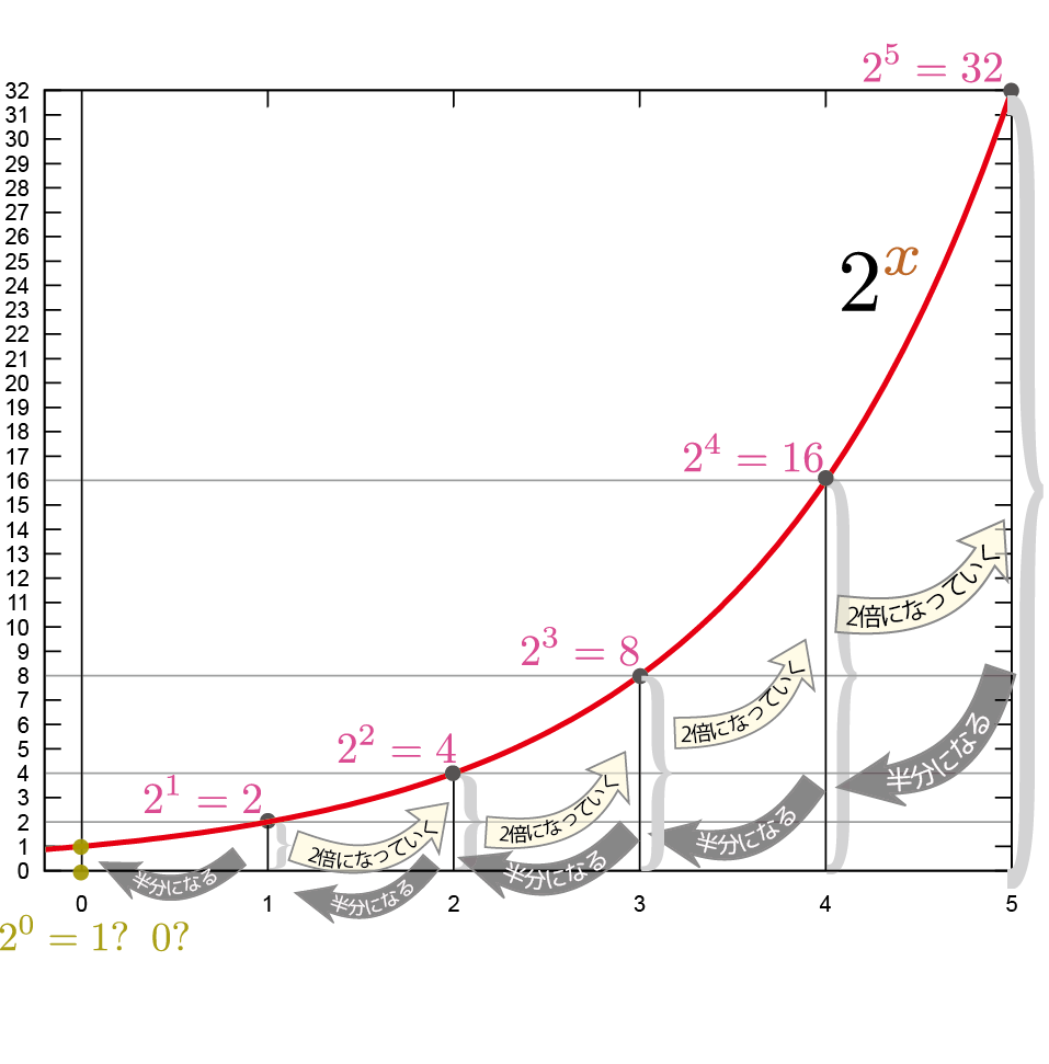 $\xcol{x}=0$のとき$\ycol{y}=1$である($2^0=1$)ことを不思議に思うかもしれない。「$2$を$0$回掛算したなら、答は0では??」と。