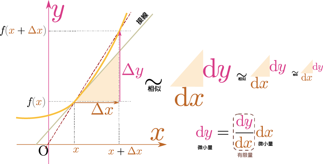 $\diff $を使った書き方では、$f\kakko{\xcol{x} + \xcol{\Delta x}}=f\kakko{\xcol{x}}+ f'\kakko{\xcol{x}}\xcol{\Delta x}+\Odr\kakko{(\xcol{\Delta x})^2}$は