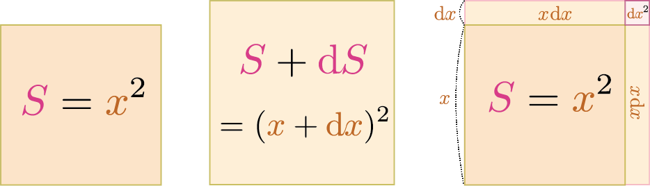 上図から面積の導関数が$\opcol{\diff \kuro{S\kakko{\xcol{x}}}\over \kidx}=2\xcol{x}$だと理解できる。「縦」の変化による面積変化$\xcol{x}\coldx$と「横」の変化による面積変化$\xcol{x}\coldx$の和が微分$2\xcol{x}\coldx$となっている。$\coldx^2$の部分は無視されている。