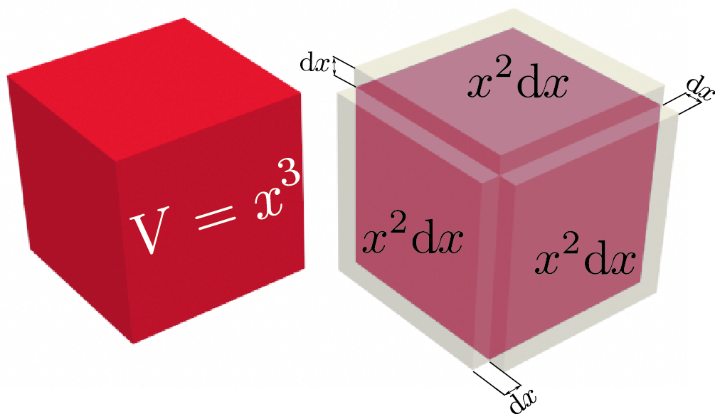 次に$\ycol{y}=\xcol{x}^3$を考えよう。今度はまず図で考えることにして、右の図のように立方体が大きくなるところを想像するとよい。体積が$\xcol{x}^2\coldx$増える場所が3箇所あるから、$3\xcol{x}^2\coldx$という式が微分の結果として出てきそうである。他に$\xcol{x}\coldx^2$が三つと$\coldx^3$が一つあるが、高次の微小量として無視できる。このことを数式で確認しよう。