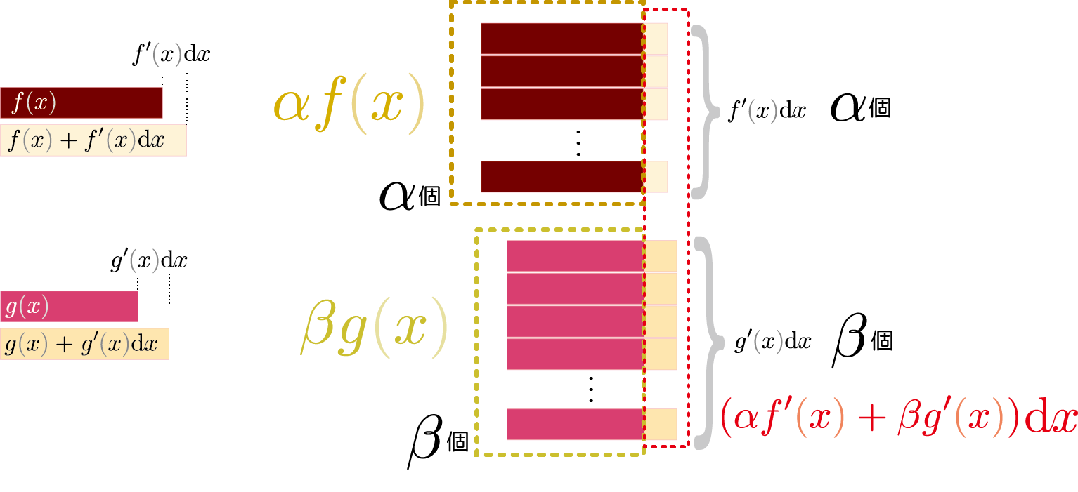 確認するには、$\alpha f\kakko{\xcol{x}}+\beta g\kakko{\xcol{x}}$を微小変化させてみればよい(ここ以後しばらくの計算では$\Odr\kakko{(\coldx)^2}$には興味がないので省略する)。 \begin{equation} \begin{array}{rl} \alpha f\kakko{\xcol{x}+\coldx}+\beta g\kakko{\xcol{x}+\coldx} =& \alpha \underbrace{(f\kakko{\xcol{x}}+f'\kakko{\xcol{x}}\coldx)}_{\small f\kakko{\xcol{x}+{\coldx}}}+\beta \underbrace{(g\kakko{\xcol{x}}+g'\kakko{\xcol{x}}\coldx)}_{g\kakko{\xcol{x}+{\coldx}}} \\ =&\alpha f\kakko{\xcol{x}}+\beta g\kakko{\xcol{x}} +\underbrace{ (\alpha f'\kakko{\xcol{x}}+\beta g'\kakko{\xcol{x}})}_{(\alpha f\kakko{\xcol{x}}+\beta g\kakko{\xcol{x}})'}\coldx \end{array} \end{equation} となって線形性が確認できる。この式をあえて図で表現しておくと以下のようになる。