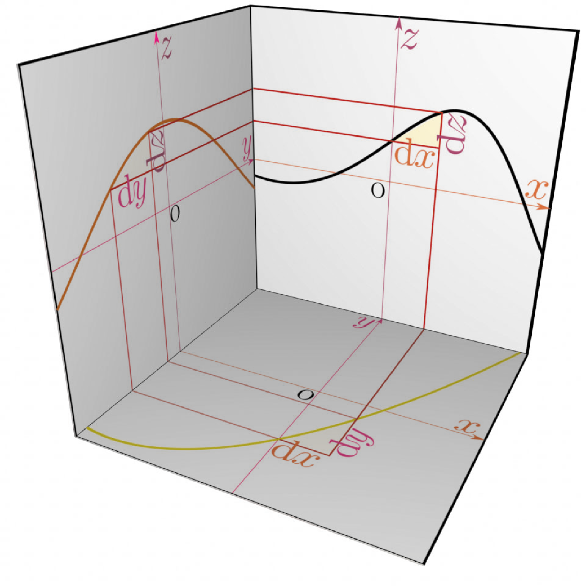$\xcol{x}\to\ycol{y}\to\zcol{z}$($\ycol{y}=f\kakko{\xcol{x}},\zcol{z}=g\kakko{\ycol{y}}$)という関係がある時、$\xcol{x}$を微小変化させた時にそれに応じて$\ycol{y}$が、さらに連鎖して$\zcol{z}$が変化する様子を前に書いた図同様、立体図で表現しよう。