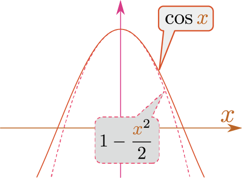 上の図のように、$\cos \xcol{x}$と$1-{\xcol{x}^2\over2}$のグラフは$\xcol{x}=0$付近ではそっくりである)。同様に、