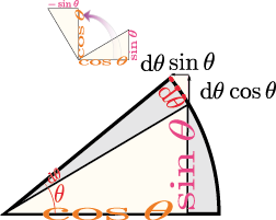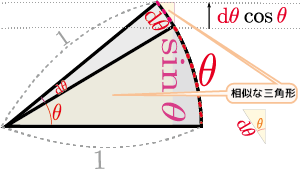 の$\sin$の方を使って \begin{equation} \sin \kakko{\thetacol{\theta}+\coldtheta}=\sin \thetacol{\theta} \underbrace{\cos \coldtheta}_{\to1}+ \cos \thetacol{\theta} \underbrace{\sin \coldtheta}_{\to{\coldtheta}} \end{equation} という式を出す。$\coldtheta$は0に近づけるのだから$\coldtheta$の1次までのオーダーまでしか見ないことにすると$\sin \coldtheta =\coldtheta,\cos\coldtheta=1$であるから、 \begin{equation} \sin \kakko{\thetacol{\theta}+\coldtheta}= \sin \thetacol{\theta}+\underbrace{\cos \thetacol{\theta}}_{微係数}\coldtheta \end{equation} となる。$f\kakko{\xcol{x}+\coldx}=f\kakko{\xcol{x}}+f'\kakko{\xcol{x}}\coldx$と比較することにより、以下がわかる。