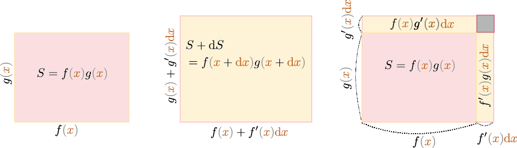 次の「ライプニッツ則(Leibniz rule)」は具体的には、 \begin{equation} \begin{array}{rl} f\kakko{\xcol{x}+\coldx}g\kakko{\xcol{x}+\coldx} =&\underbrace{(f\kakko{\xcol{x}}+f'\kakko{\xcol{x}}\coldx)}_{\small f\kakko{\xcol{x}+\coldx}}\underbrace{(g\kakko{\xcol{x}}+g'\kakko{\xcol{x}}\coldx)}_{\small g\kakko{\xcol{x}+\coldx}}\\ =&f\kakko{\xcol{x}}g\kakko{\xcol{x}}+f'\kakko{\xcol{x}}g\kakko{\xcol{x}}\coldx+f\kakko{\xcol{x}}g'\kakko{\xcol{x}}\coldx\\[3mm] =&f\kakko{\xcol{x}}g\kakko{\xcol{x}}+\underbrace{(f'\kakko{\xcol{x}}g\kakko{\xcol{x}}+f\kakko{\xcol{x}}g'\kakko{\xcol{x}})}_{(f\kakko{\xcol{x}}g\kakko{\xcol{x}})'}\coldx\\ \end{array} \end{equation} という計算をやると、右辺の$\coldx$の1次のオーダーの係数(微係数)が$f'\kakko{\xcol{x}}g\kakko{\xcol{x}}+f\kakko{\xcol{x}}g'\kakko{\xcol{x}}$であることがわかる。下の図はこの微分演算で行われている微小変化のイメージである。