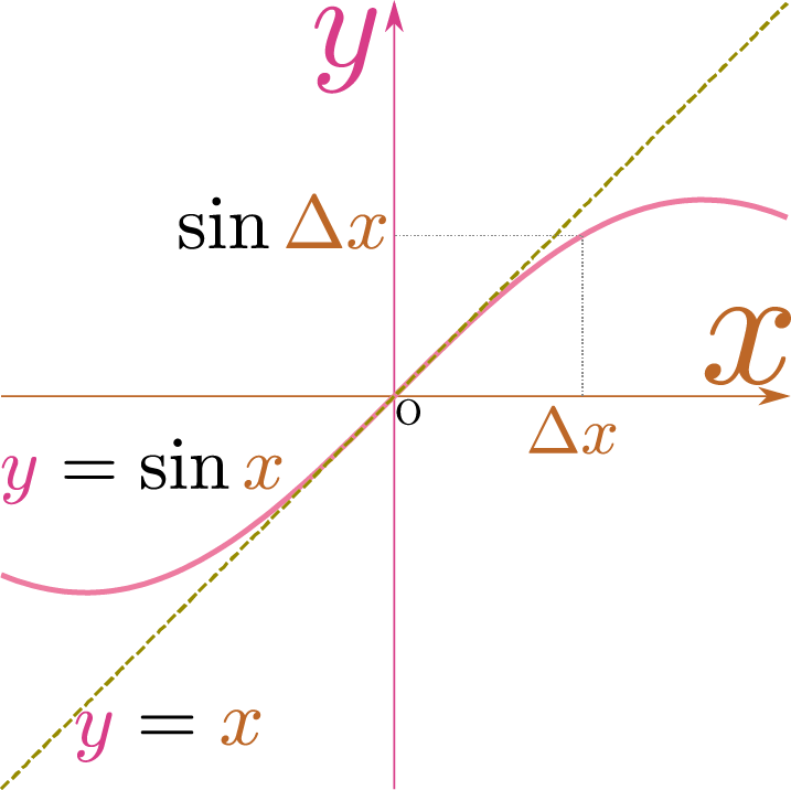 $\sin \xcol{x}$は$\xcol{x}=0$付近では$\xcol{x}$とほぼ同じ(原点を通り傾き1)であり、$\lim_{\xcol{\Delta x}\to0}{\sin\xcol{\Delta x}\over \xcol{\Delta x}}=1$であった。