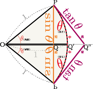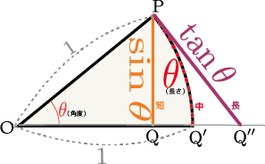 $\theta$が0付近の小さい角度であるとき、 \begin{equation} \xcol{\sin {\theta}}<\thetacol{\theta}<\tcol{\tan{\theta}} \end{equation} という関係がある。それを示すには、$\sin\thetacol{\theta},\thetacol{\theta},\tan \thetacol{\theta}$の三つは、図に示した三つの経路を伝わって点${\rm P}$から点${\rm Q}$、点${\rm Q'}$、点${\rm Q''}$へと向かう線(真ん中のだけは曲線で、残り2本は直線)の長さであることを使う。