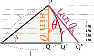 上の図に点線で示したように三角形を$n$階建てのビルだと考え、各々の階での線の長さを見る。各階の高さを小さくすれば($n$階建ての$n$が無限に大きい極限を考えれば)全ての線はほぼ直線であるから、線の鉛直に対する傾きを見ることで、線の長さが $$ \xcol{\sin\theta の一部}<\thetacol{{\theta}の一部}<\tcol{\tan{\theta}の一部} $$ だとわかる。