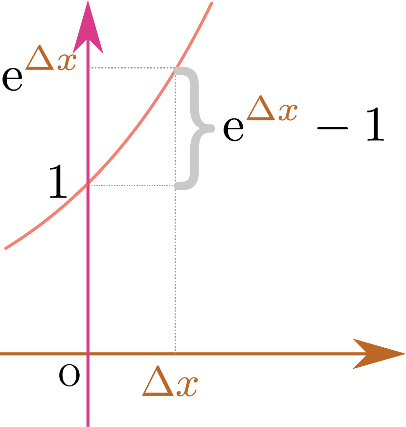 残った部分$\lim_{\xcol{\Delta x}\to0}{\E^{\xcol{\Delta x}}-1\over \xcol{\Delta x}}$はよく見ると$\xcol{x}$によらない定数である。これは$\ycol{y}=\E^\xcol{x}$の$\xcol{x}=0$での傾きそのもの(次のグラフ参照)