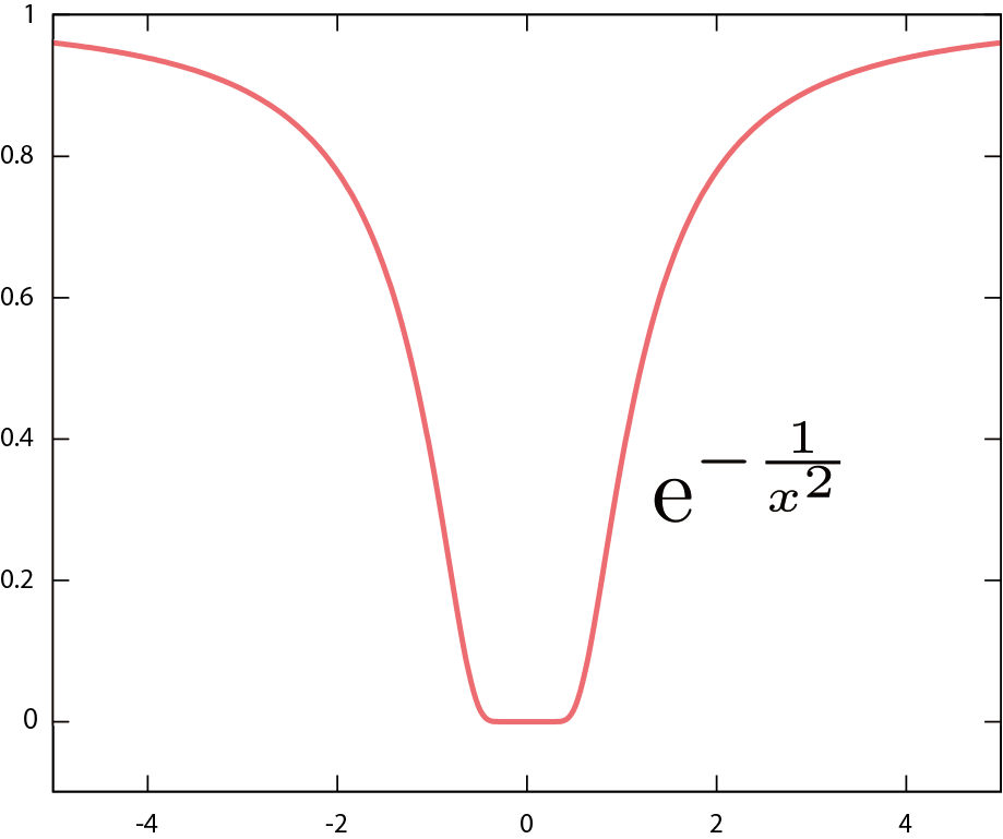 公式どおりにいかない例の一つとして、$f\kakko{\xcol{x}}=\E^{-{1\over \xcol{x}^2}}$という関数を考えよう。この関数は$\xcol{x}=0$での値は定義されていないが、