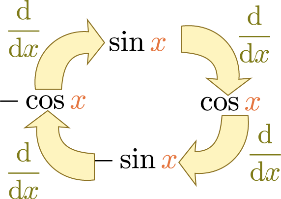 $\sin \xcol{x}$を例にして考えよう。すでに述べたように、$\sin \xcol{x}$は$\xcol{x}=0$で0であり、傾き1である。よって$\sin \xcol{x} \simeq \xcol{x}$と書けるのであった。$\sin \xcol{x}$の一階微分は$\cos \xcol{x}$、二階微分は$-\sin \xcol{x}$である。三階微分は$-\cos \xcol{x}$となり、微分するごとに$\sin \xcol{x}\to\cos\xcol{x}\to -\sin\xcol{x}\to -\cos\xcol{x}\to \sin \xcol{x}$と4つの関数をぐるぐる回る。分類すれば、 \begin{equation} \left(\ddx\right)^n \sin \xcol{x}= \begin{cases} \sin\xcol{x}& n=4m\\ \cos\xcol{x}& n=4m+1\\ -\sin\xcol{x}& n=4m+2\\ -\cos\xcol{x}& n=4m+3 \end{cases}~~~(mは0以上の整数)\label{sindiffn} \end{equation} であり、これに$\xcol{x}=0$を代入すれば \begin{equation} \left(\ddx\right)^n \sin \xcol{x} \biggr|_{\xcol{x}=0}= \begin{cases} 0& n=2m\\ 1& n=4m+1\\ -1& n=4m+3 \end{cases}~~~(mは0以上の整数)\label{sinexpcof} \end{equation} ($n=4m$と$n=4m+2$は一つにまとめて$n=2m$とした)であるから、 \begin{equation} \sin \xcol{x}=\xcol{x} - {\xcol{x}^3\over 3!}+ {\xcol{x}^5\over 5!}-{\xcol{x}^7\over 7!}+\cdots\label{sintaylor} \end{equation} のようにテイラー展開できる偶数次の項が出てこないのが$\sin$の特徴であるが、$\sin$に限らず奇関数なら常に奇数次しか出てこない。ただし、$\xcol{x}=0$以外で展開した場合はこの限りではない。。