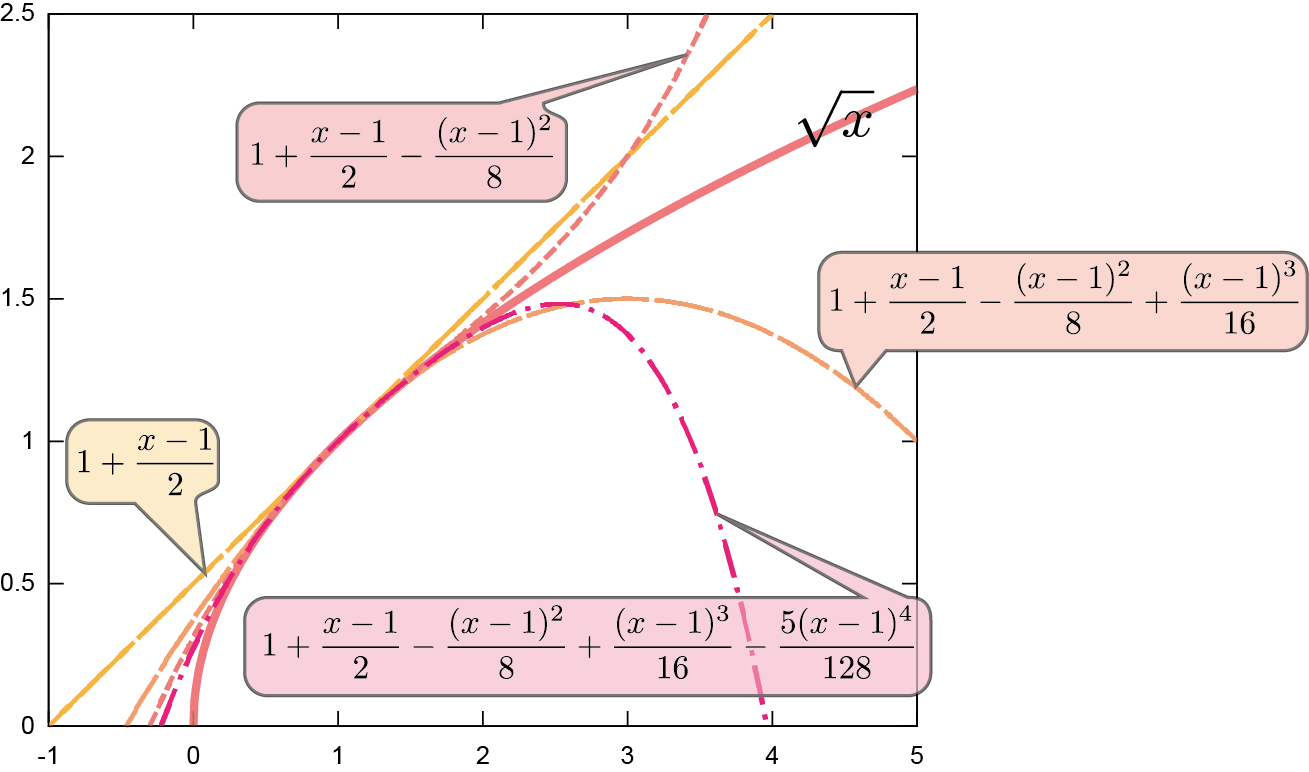 では$\sqrt{\xcol{x}}$のような関数はどうやって近似するかというと、$\xcol{x}=0$以外、たとえば$\xcol{x}=1$の周りにテイラー展開する。$\xcol{x}=1$でなら、${1\over 2\sqrt{\xcol{x}}}\biggr|_{\xcol{x}=1}={1\over 2}$となって値がある。二階微分も計算しておくと、$\left(\ddx\right)^2\sqrt{\xcol{x}}=-{1\over 4\xcol{x}^{3\over 2}}$となるから2次の項の係数は${1\over 2}\left(\ddx\right)^2\sqrt{\xcol{x}}\biggr|_{\xcol{x}=1}=-{1\over 8}$であり(3次以上の項については詳細は省くが同様の計算を行って)、 \begin{equation} \sqrt{\xcol{x}}= 1 +{1\over 2}(\xcol{x}-1)-{1\over 8}(\xcol{x}-1)^2+{1\over 16}(\xcol{x}-1)^3-{5\over 128}(\xcol{x}-1)^4+\cdots \end{equation} のように展開できる。たとえば電卓を叩けば$\sqrt{1.2}\fallingdotseq1.09544511501033\cdots$という式が出るが、電卓内部では上のような展開を使って計算される。やってみると、 \begin{equation} \sqrt{1.2}= \underbrace{\underbrace{\underbrace{\underbrace{1 +\underbrace{{1\over 2}(1.2-1)}_{0.1}}_{1.1}-\underbrace{{1\over 8}(1.2-1)^2}_{0.005}}_{1.095}+\underbrace{{1\over 16}(1.2-1)^3}_{0.0005}}_{1.0955}-\underbrace{{5\over 128}(1.2-1)^4}_{0.0000625}}_{1.0954375}+\cdots \end{equation} のようにして正しい値に近づいていく。下のグラフを参照せよ。