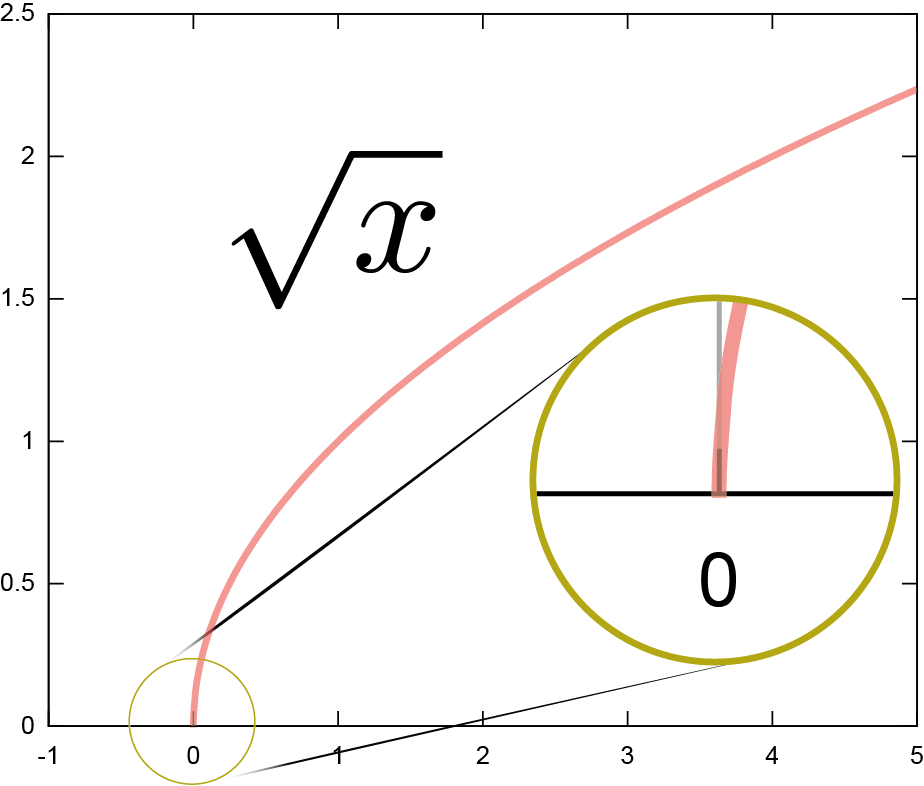 テイラー展開が可能であるためには、$f\kakko{x_0}$はもちろん、任意の階数の微係数$\ddx f\kakko{x_0},\left(\ddx\right)^2f\kakko{x_0},\cdots$が全て計算できなくてはいけない。たとえば、$f\kakko{\xcol{x}}=\sqrt{\xcol{x}}$を$\xcol{x}=0$の周りにテイラー展開することはできない(この関数は$\xcol{x}=0$において解析的でない)。$\ddx f\kakko{\xcol{x}}={1\over 2\sqrt{\xcol{x}}}$なので、$\xcol{x}=0$では微分が存在しない(あえて書くなら$\infty$)。グラフでは、$\xcol{x}=0$において線が垂直に立っていることで「微分できない」ことが表現されている。