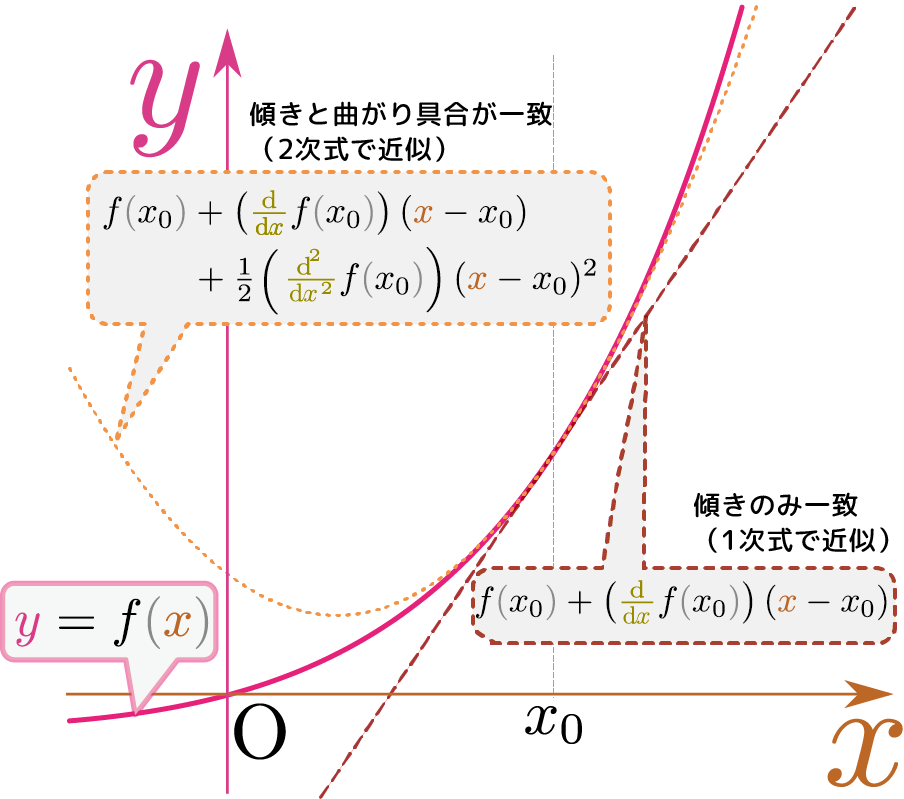 微分の表現:$f\kakko{\xcol{x} + \xcol{\Delta x}}\simeq f\kakko{\xcol{x}}+ f'\kakko{\xcol{x}}\xcol{\Delta x}$を思い出し、$\xcol{x}\to x_0,\xcol{\Delta x}\to \xcol{x}-x_0$と置き直すと、 \begin{equation} f\kakko{\xcol{x}}\simeq f\kakko{x_0}+\left( \ddx f\kakko{x_0}\right)(\xcol{x}-x_0) \end{equation} ということになるこの$\ddx f\kakko{x_0}$は「関数$f\kakko{\xcol{x}}$を$\xcol{x}$で微分した後に$\xcol{x}$に$x_0$を代入したもの」という意味である(先に代入してしまったら微分すると0である)。すでに代入が終わっているので、この後$\xcol{x}$で微分すると0になる。釈然としない人がいるかもしれないが、これはそういう書き方をするのが(式を簡単に書くための)決め事なのだと思ってほしい。。この式は$\xcol{x}=x_0$を代入すると$f\kakko{x_0}=f\kakko{x_0}$となって成り立つし、$\xcol{x}$で微分してから$\xcol{x}=x_0$を代入しても成り立つ。しかしこれだと、$\xcol{x}$で二階微分すると等式は成り立たない(右辺は0になってしまうが左辺はそうとは限らない)。 \begin{equation} f\kakko{\xcol{x}}\simeq f\kakko{x_0}+\left( \ddx f\kakko{x_0}\right)(\xcol{x}-x_0)+{1\over 2}\left( \left(\ddx\right)^2 f\kakko{x_0}\right)(\xcol{x}-x_0)^2 \end{equation} と新しい項を付け加えることで二階微分も等しくする。右辺を二階微分すると、第1項と第2項は0になり、第3項の${1\over 2}(\xcol{x}-x_0)^2$の二階微分は1になるので、結果は$\left(\ddx\right)^2f\kakko{x_0}$となり$\left(\ddx\right)^2f\kakko{x_0}$は「微分した後$\xcol{x}=x_0$を代入した結果」なのでもう$\xcol{x}$の関数ではないことに注意。、左辺の二階微分の$\xcol{x}=x_0$での値と一致する(こうなるように${1\over 2}$という係数を選んでおいた)。