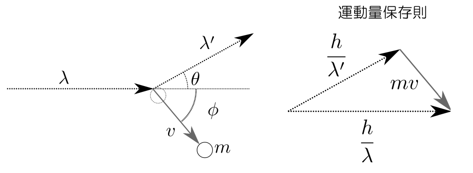 の右の図のようになる。${h\over\lambda}$という運動量を持った光が電子に運動量$mv$を与えて自身の運動量が${h\over \lambda'}$に変化している。このベクトル図で表される関係が常に成立することは、光が${h\over \lambda}$という運動量をもった一つの塊として電子にぶつかっていると考えなくては説明がつかない。エネルギー$h\nu$を持った光が電子に運動エネルギー${1\over2}mv^2$をあたえ、自身のエネルギーが$h\nu'$に減ったと考えれば、エネルギー保存則は \begin{align} h\nu = h\nu' + {1\over2}mv^2 \label{Ehozon} \end{align} である。一方、運動量保存則をしめす三角形の図に対して余弦定理を使うと、 \begin{align} (mv)^2 = \left({h\over\lambda}\right)^2 + \left({h\over \lambda'}\right)^2 -2{h\over\lambda}\cdot{h\over \lambda'}\cos\theta \label{phozon} \end{align} という式が出る。二つの式から$v$を消去して計算することで、 \begin{align} {2mc\over h} \left(\lambda'-\lambda\right) =& {\lambda'\over\lambda}+ {\lambda\over \lambda'} -2\cos\theta\label{twominustwocos} \end{align} という式を出すことができる。ここで、実際にコンプトン効果で起こる波長の変化は小さいので、$\lambda'=\lambda+\Delta \lambda$とすると、 ${\lambda'\over \lambda}= 1+{\Delta\lambda\over\lambda}$であり、かつ、$\Delta\lambda$の1次までで近似すれば、$ {\lambda\over \lambda'}= {1\over 1+{\Delta \lambda \over \lambda}}=1-{\Delta \lambda \over \lambda}+ \left({\Delta\lambda\over \lambda}\right)^2 - \cdots $と展開できる。ゆえに$\left({\Delta\lambda\over \lambda}\right)^2$以上のオーダーを無視すれば \begin{align} \underbrace{ 1+{\Delta\lambda\over\lambda} }_{{\lambda'\over \lambda}} +\underbrace{ 1-{\Delta \lambda \over \lambda}+ \left({\Delta\lambda\over \lambda}\right)^2 - \cdots}_{{\lambda\over \lambda'}} =2+\left({\Delta\lambda\over \lambda}\right)^2 - \cdots \fallingdotseq 2 \end{align} となる。${\lambda'\over\lambda}+ {\lambda\over \lambda'}$も2に近似して まとめると、 \begin{align} {2mc\over h}\left( \lambda'-\lambda \right) &\fallingdotseq 2-2\cos\theta\nonumber\\ \lambda'-\lambda &\fallingdotseq {h\over mc}\left(1-\cos\theta\right)\label{comptonth} \end{align} という、コンプトンによる実験式と数値的に一致する式が出る。