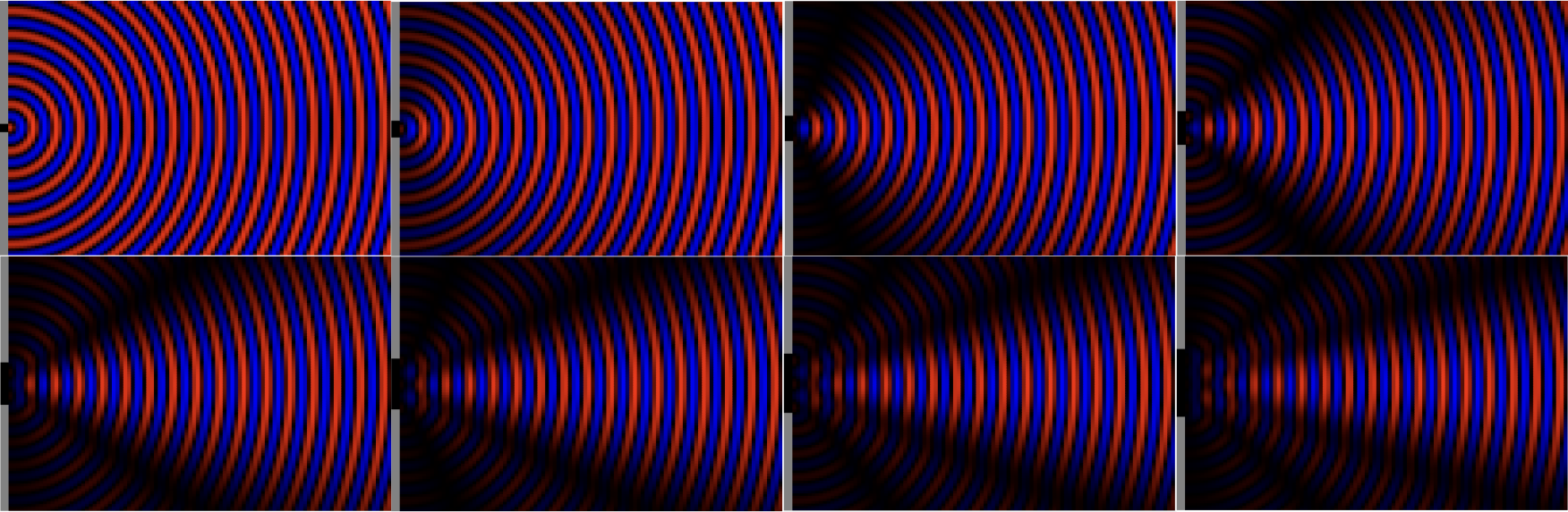 ↑のアプリでスリット幅を変えていくと、スリット幅が小さいときに波がむしろ「広がる」ことがわかります(下の図)。