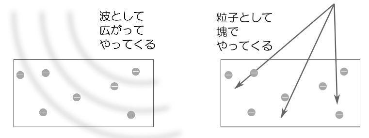 光電効果という現象において大事なことは、光を波と考えた場合と粒子と考 えた場合で、そのエネルギーが金属に与えられるときに連続的に与えられるのか、不連続な塊で与えられるのかという大きな違いがある、ということである。、光のエネルギーが金属全部に広がった波の形でやってくるとすると、ある程度の時間がたった後でなければ電子は飛び出さないことが計算してみるとわかる。しかし実験は、ただちに電子が飛び出すという結果をみせている。光を波だと (連続的に広がった 状態で金属にやってくるものだと) 考えるならば、金属の中に、(どんなものな のか想像もつかないが)「広がってやってきた光のエネルギーをかきあつめて電子一個に与えるメカニズム」があることになる。もちろんそんなものはない。光電効果は、光が「光子」というエネルギーの塊として降ってきていることを示しているのである。